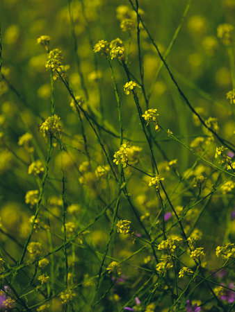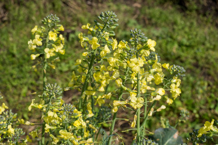 Mustard flower blossoms in the field, springtime, closeup of photo