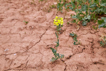 rapeseed flower growing on dry cracked soil, blooming rapeseed field in spring in May
