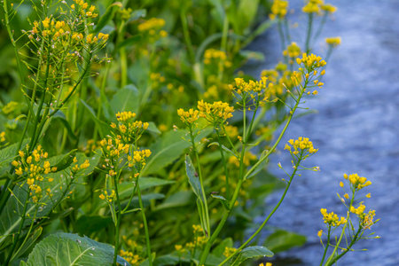 Bright yellow mustard flowers bloom along a canal in southern Fukuoka Prefecture, Japan.