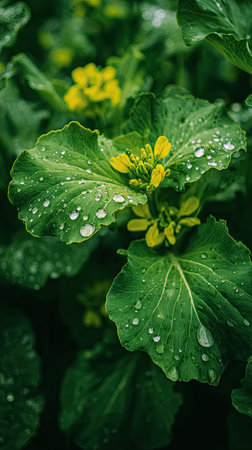 Rapeseed in gentle light rain, soft raindrops visible on vivid green leaves, natural realistic style, bright fresh colors, balanced wide composition, cinematic framing, highly detailed.