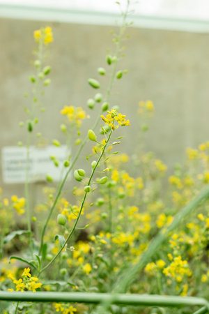 Rapeseed field with green pods and flowers close up and blurred background on a summer sunny day. High quality photo