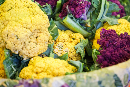 Colorful cauliflower. Various sort of cauliflower on stone tiles gray concrete background. Purple, yellow, white and green color cabbages. Broccoli and Romanesco. agricultural harvest. Mock up.