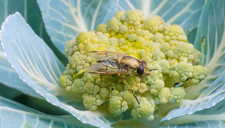 Insects hover over the blooming cabbage flowers, contributing to pollination in a lush garden during the growing season.