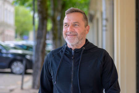 Middle-aged man chuckling to himself as he walks through town in a quiet street looking aside with a smile in a head and shoulders portrait