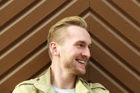 Close up portrait of a happy young man standing against a wooden wall outdoors wearing a yellow jacket with a big smile on his face.