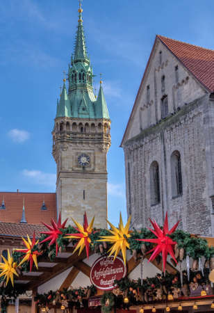 Brunswick, Lower Saxony, Germany, December 7th 2017: The old town hall and the cathedral in the background of the Christmas market of Brunswick