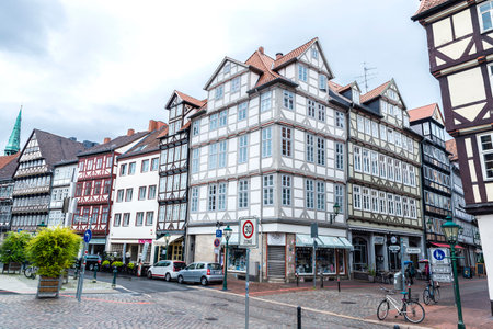 Hanover, Germany - August 18, 2019: Facade of classic rustic buildings, shops and people around in the old town of Hanover, Germany
