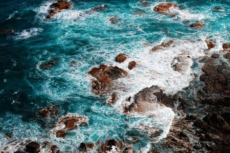 Waves pounding the rocks seen from above. Amazing aerial perspective of the Atlantic Ocean off the coast of New Zealand with its rugged shores and blue turquoise ocean