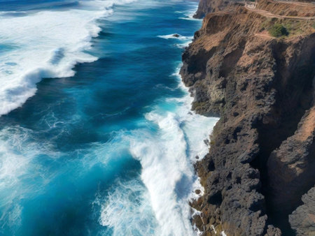 A stunning view of ocean waves crashing against coastal cliffs, showcasing the power and beauty of nature.