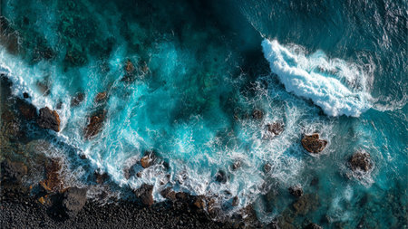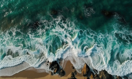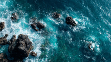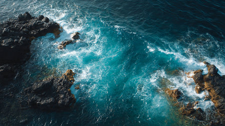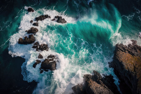 Captivating aerial image showcasing dynamic ocean waves as they crash against rugged rocks, creating foam and stunning textures in a vibrant seascape.