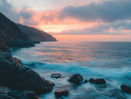 Scenic Sunset Over Rocky Coastline with Rolling Waves and Cliffs.