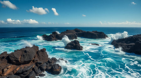 An AI generated illustration of the ocean waves crashing against the rocky shoreline, creating a mesmerizing display of motion and power