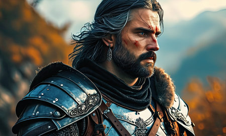 Portrait of a medieval warrior in armor on the background of the mountains.