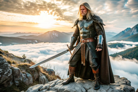 Medieval warrior with sword and shield standing on the top of the mountain.