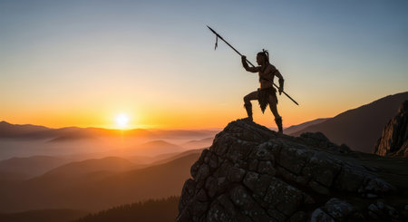 Silhouette of young male warrior with spear overlooking mountain sunset