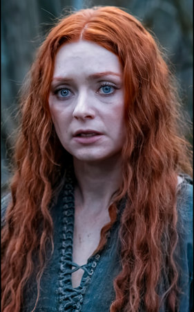 A man with long braided hair and a thick beard stands in a forest, showing a serious expression. His eyes display strength, reflecting deep thought amidst a serene backdrop.
