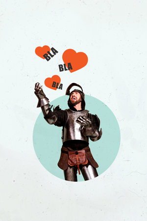 Template collage design trend 3D sketch of love romantic couple date Valentine heart young man warrior knight hero conqueror sing song