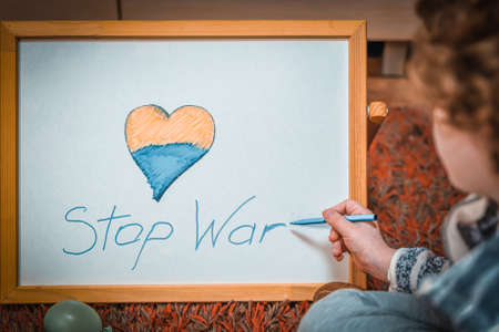 Ukrainian flag and a heart in yellow and blue color. Child writes Stop the war