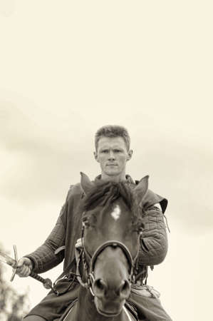 Artwork. Young man as medieval warrior, knight isolated on dark vintage background. Random stroke of yellow paint on his face. Art, creativity, eras comparison concept.