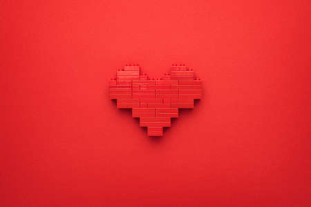 Red heart symbol made of plastic building blocks. Flat lay image of like button on red background. Top-down composition of toy pixelated heart model. Minimalist photo of stylized red love symbol.