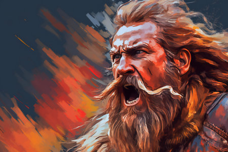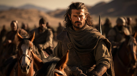 Portrait of brave cossack warrior riding horse and creaming over blaze fire burning on battlefield background. Ancient military man, historic occasion. Generative AI
