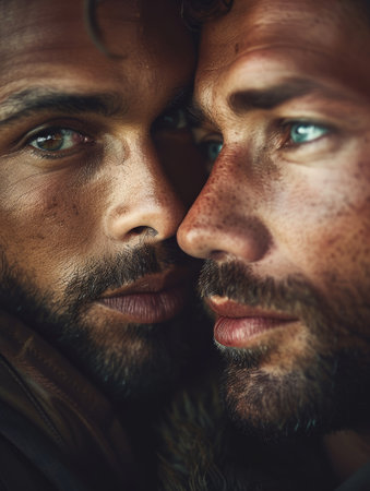 Intimate portrait LGBTQ couples deep affection, close bond portrayed tenderly, emotive expressions convey love.