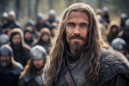 Joyful man with long hair and beard, surrounded by a diverse crowd, wearing traditional attire, radiating warmth and connection in a lively historical atmosphere