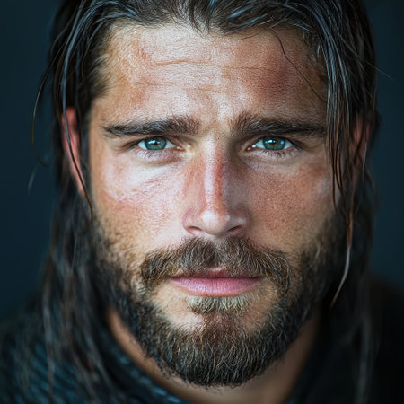 Fierce medieval warrior with battle-worn armor and bloodied face