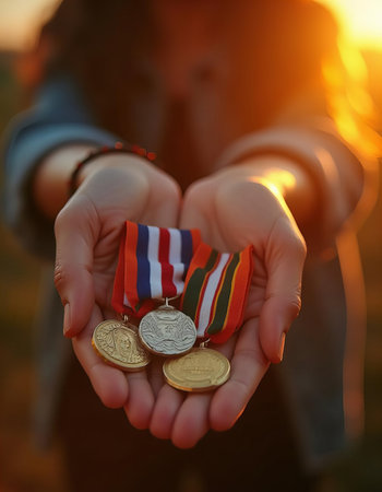 Macro shot of a medal edge shining under sunlight, showcasing intricate details and a warm, victorious tone. The cinematic composition highlights the texture and craftsmanship.