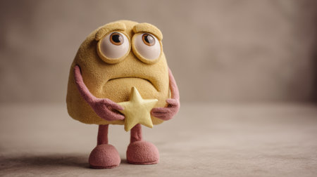 A small cartoon character with sad eyes stands alone, holding a star. The backdrop is clean, enhancing the emotional story being told.
