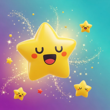 A cheerful, anthropomorphic yellow star with a wide smile and closed eyes, surrounded by smaller stars and glowing particles on a gradient background.