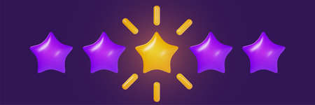 Five glossy star with yellow sunburst isolated on violet background. Realistic sweet 3d design element for quality rating. Cartoon colorful clay, plastic or soft toy. Beautiful vector illustration.