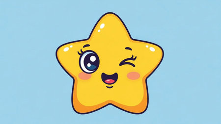 A cheerful, cartoonish yellow star character with large, expressive eyes and rosy cheeks winks playfully against a solid blue background.
