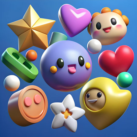 A playful collection of 3D cartoon icons featuring a smiling face. hearts. stars. and other cheerful designs. Perfect for adding a whimsical touch to your projects.