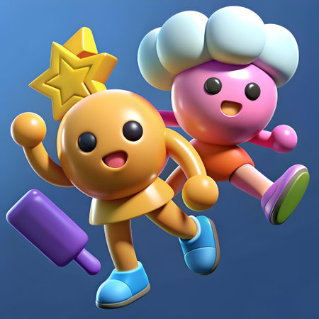 Cheerful 3D cartoon characters. a happy yellow girl with a star on her head and a friendly pink girl with fluffy hair. running together on a blue background. Perfect for children's apps. games. and illustrations.