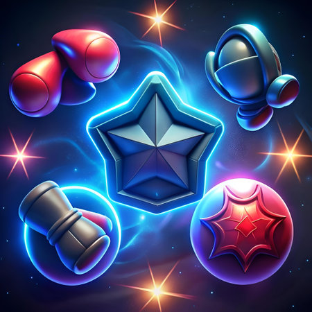 A set of 5 vibrant 3D icons featuring a star. boxing gloves. a spaceship. a shield. and a gauntlet. Perfect for game design. app interfaces. and branding projects.