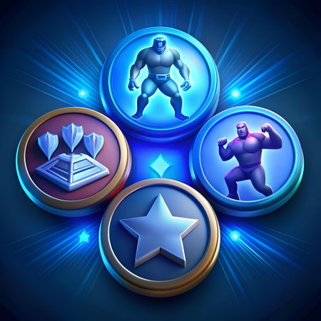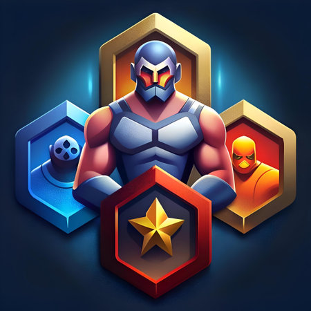 A powerful 3D icon depicting a muscular fighter holding a golden star. surrounded by hexagonal shields. perfect for game UI. app design. or branding.