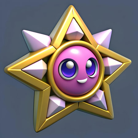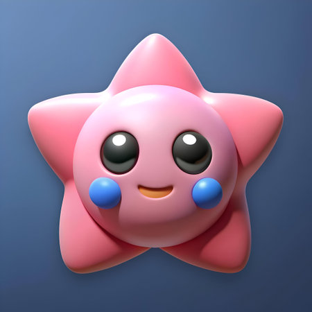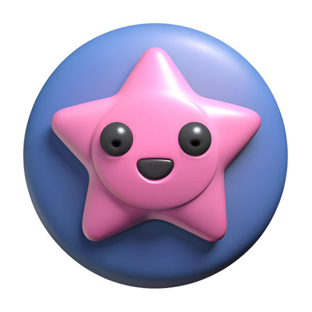A cheerful. 3D pink star with big eyes and a friendly smile. sitting on a blue circular background. Perfect for adding a playful touch to children's designs. social media. and branding.