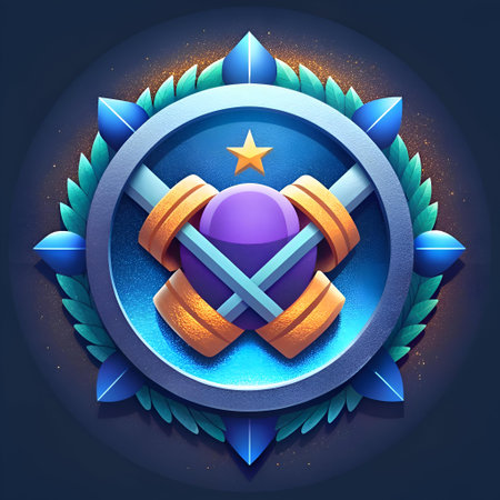 A vibrant. stylized emblem featuring a purple orb. crossed swords. and a golden star. all encased in a laurel wreath. Perfect for game interfaces. fantasy themes. and achievement rewards.