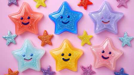 Photo of star-shaped stickers with smiling faces and glittery textures , isolated on simple pastel color background, photorealistic, hyperrealistic --ar 16:9 Job ID: 822c9e0c-1f9b-40fd-9e79-dc1859d8b4cf