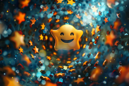 A smiling star surrounded by a bunch of other stars. The star is the main focus of the image and it is happy. The other stars are scattered around the star, creating a sense of depth and movement