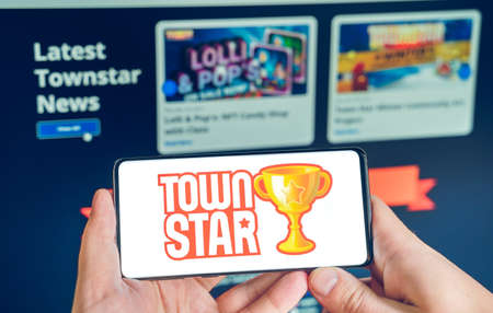 Russia Moscow 25.12.2021 Logo of Townstar. Blockchain nft ethereum cryptocurrency strategy game. Man playing in laptop,mobile phone. Crypto coin, token. Earning digital money.Play-to-earn.