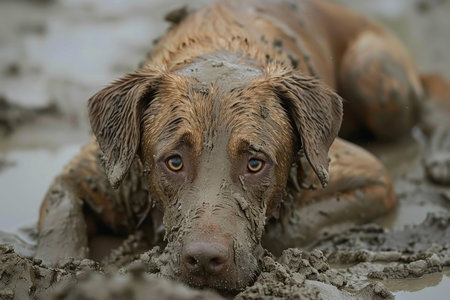 Closeup of a dirty dog looking guilty and adorable after playing in the mud