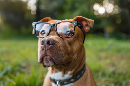 Brown dog with a smart look poses in glasses outdoors, bokeh background