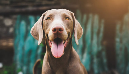 cute playful doggy or pet is playing and looking happy on background brown weimaraner young dog is posing cute happy crazy dog headshot smiling on