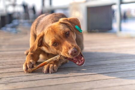 Brown stray dog eating bone in a sidewalk