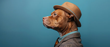 Dog in suit and hat, blue background, profile view, stylish and cool