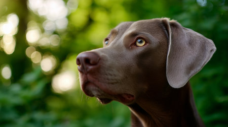 Brown dog gazing thoughtfully in a lush green forest during daytime