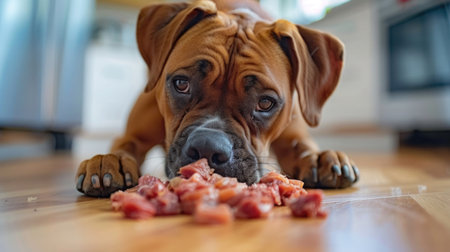 A boxer dog eagerly devouring a mix of raw meat strips, placed directly on a clean, light-colored floor.