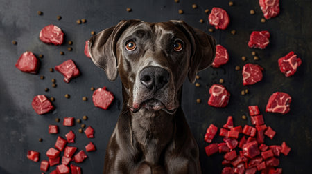 A Great Dane standing over a scattered assortment of raw beef cuts on a stark black mat, emphasizing the size and appetite of the breed.